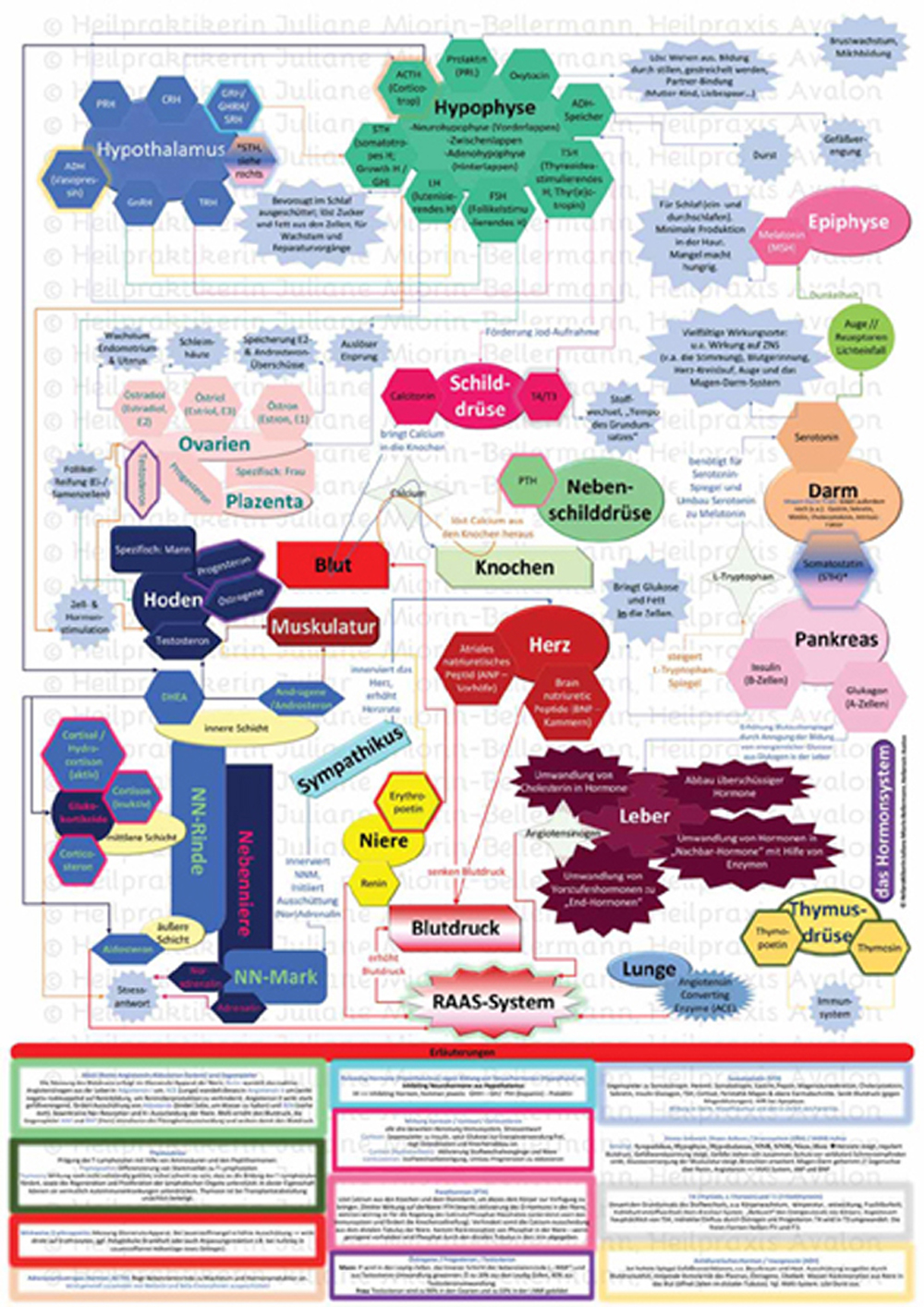 Plakat über das Hormonsystem ... Endlich verstehen, wie die Hormondrüsen miteinander interagieren. Die von Juliane Herzberg (ehemals Miorin-Bellermann) entworfene Lehrtafel zeigt die direkte Wirkung der Hormone und Hormondrüsen zueinander in einer schematischen Darstellung auf DIN A1.